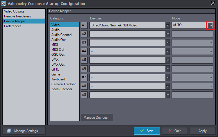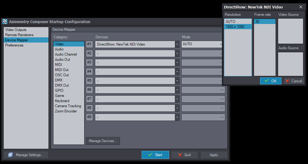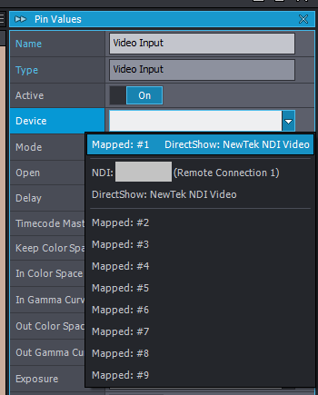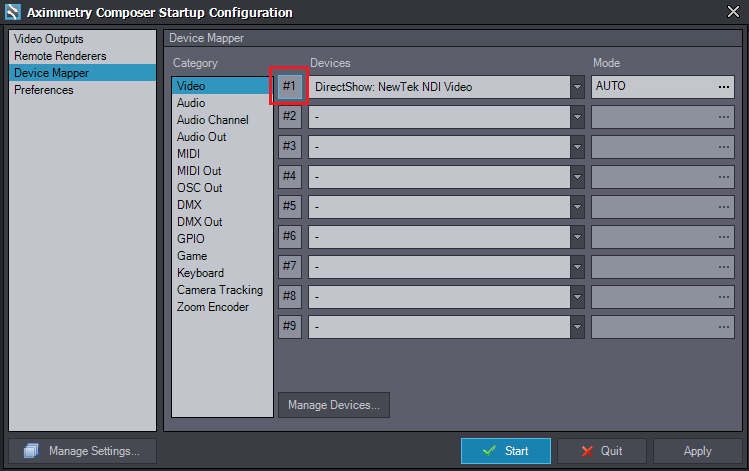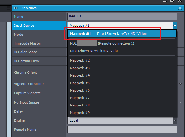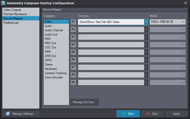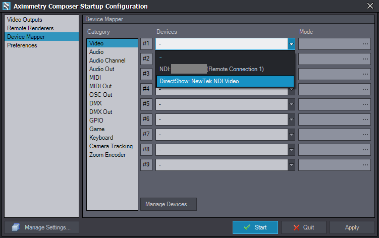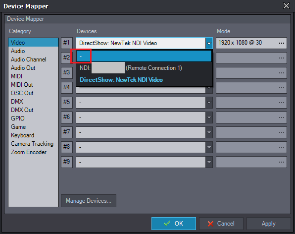 Here for example we have selected an NDI device with a manually set Mode of 1080p30 and mapped it to ID #1: