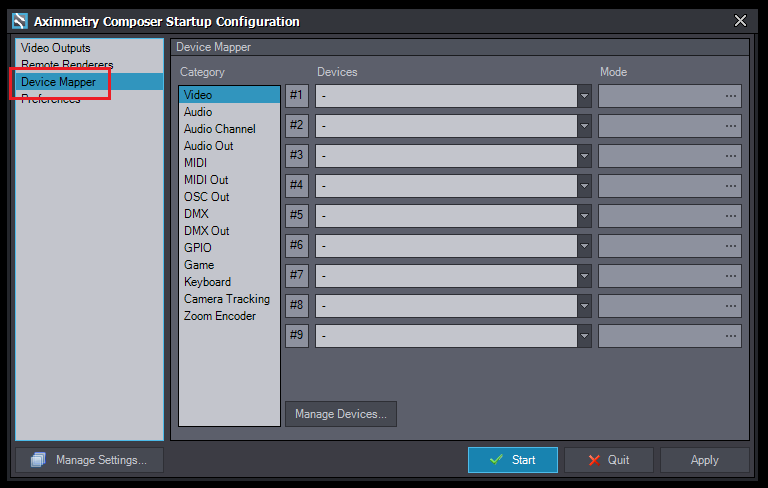 IMPORTANT: If you map a device, you will only be able to use it with the mapped settings. If the device settings change then you have to change the corresponding settings in the Device Mapper as well (unless the Mode is set to AUTO), or unmap it and use it without mapping.