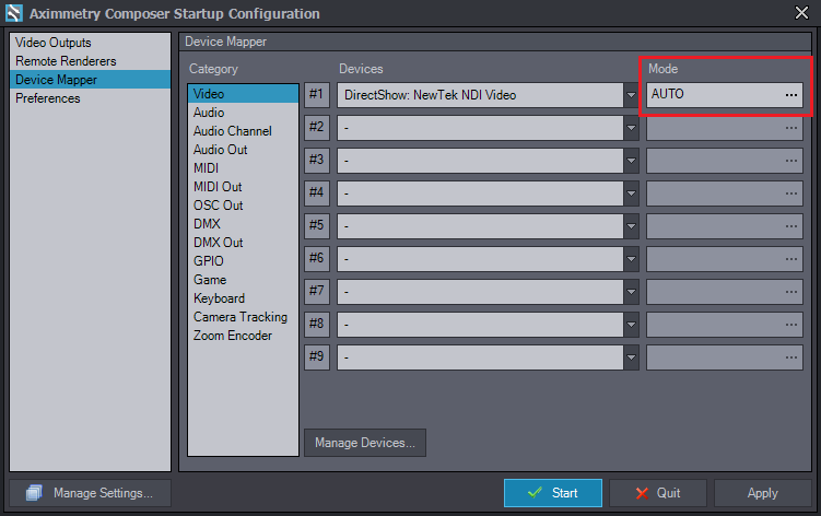 NOTE: As the AUTO mode automatically determines the correct Mode settings for the video input signal, it allows for changing settings on the input device (e.g. studio camera) without the need for manually changing the corresponding settings in the Device Mapper.