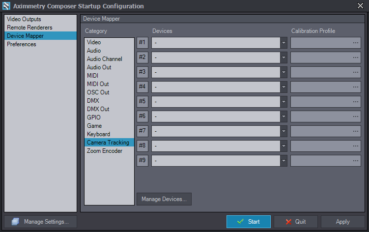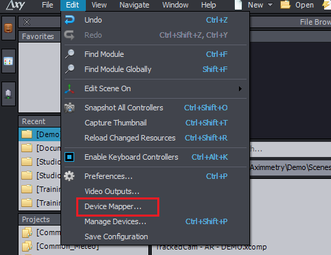 Aximmetry's Device Mapper can be accessed from the Startup Configuration screen when you start Aximmetry, or if Aximmetry is already running, from the Edit menu.