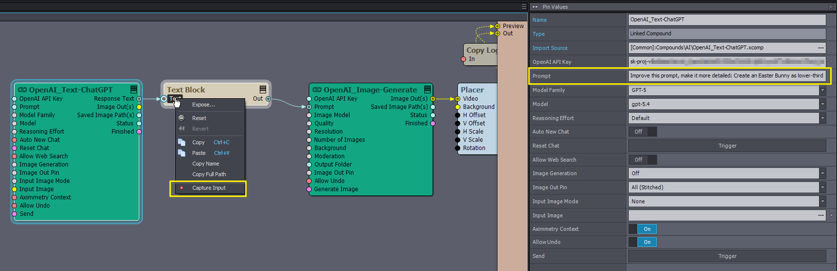 プレビューで確認した後、OpenAI_Image-Generateコンパウンド内のImage Out Pinを使用して最適な画像を選択します。次に、PlacerモジュールのOffsetおよびScaleピンを使用して、画面上にグラフィックを配置します。