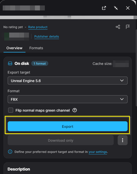Epic Games Launcherで、Fabタブに移動し、インポートしたいアセットを選択し、ダウンロード後にエクスポートをクリックします: