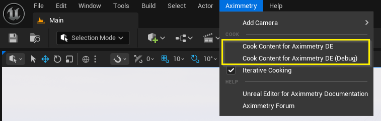 クックを開始するには、Aximmetry メニューを開き、Aximmetry 向けにコンテンツをクックを選択します: