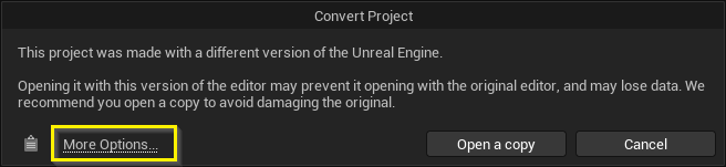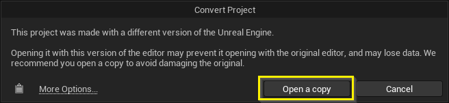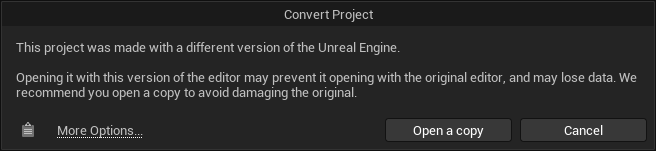標準Unreal Engineで作成したプロジェクトをAX Scene Editorで開くと、変換ウィンドウが表示されます。このウィンドウでは「コピーを開く」オプションを選択することを推奨します。このプロセスの詳細は、下記のプロジェクト変換プロンプトセクションを参照してください。