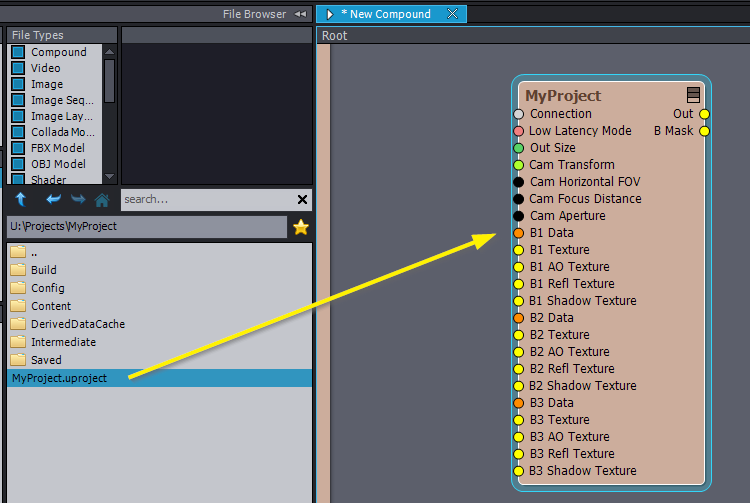 Unrealプロジェクトのルートディレクトリから.uprojectファイル(AX Scene Editorで以前に使用されたもの)をドラッグします。これによりUnreal Projectモジュールノードが作成されます: