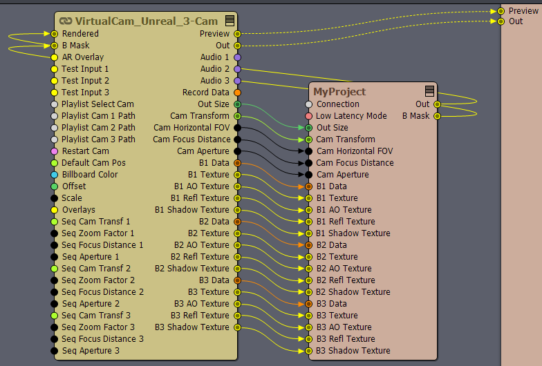 さらに、カメラコンパウンドの「プレビュー」および「出力」ピンを、上記画像のように露出します。これにより、レンダリングされたカメラ画像がAximmetryのプレビューパネルに表示されます。