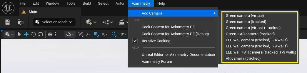 Aximmetryのカメラコンパウンドでシーンを使用するには、シーン内にAximmetryカメラブループリントを配置します。メニューバーのAximmetry項目からAdd Cameraを選択することで実行可能です。