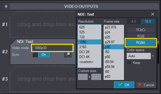 ビデオモードのフィールドをクリックし、希望の解像度とフレームレートを選択します。NDI規格でサポートされている全オプションが利用可能です。また、フォーマットがRGBAに設定されていることを確認してください:
