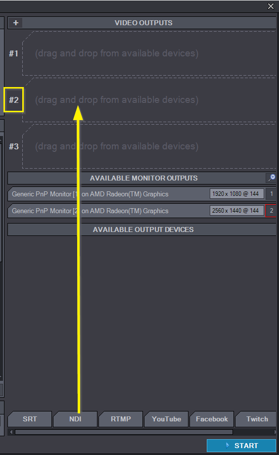 スタートアップ設定画面で、NDIオプションを2番目のビデオ出力スロットにドラッグ&ドロップします: