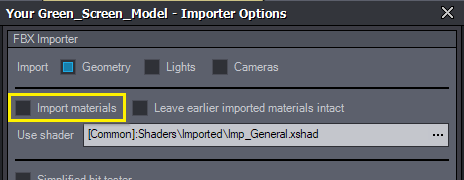 マテリアルがインポートされないようにするには、モデルのコンパウンドを右クリックし、インポーターオプションの設定...を選択します。表示されるウィンドウでマテリアルをインポートのチェックを外し、OKをクリックします:
