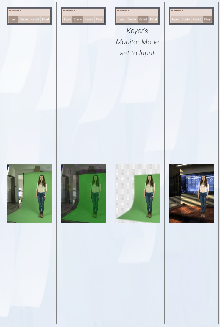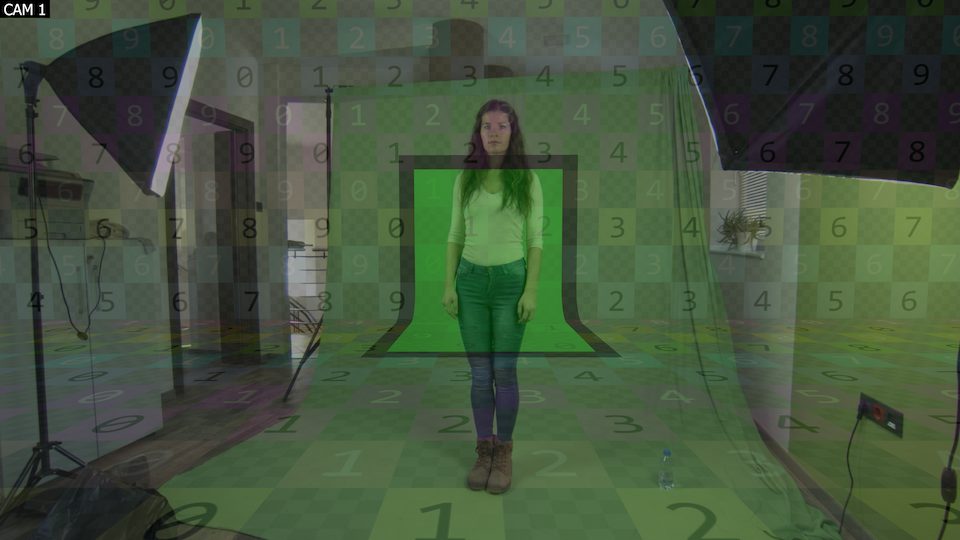 キー処理済み&マスク処理済み:このモードでは、グリーンスクリーン領域に基づいてキー処理とマスク処理が施された後の実世界カメラ入力のみを表示します。キー処理の結果を評価するのに有用です。例えば、グリーンスクリーンの一部が適切にキー処理されておらず、グリーンエリアを小さくすることでそれらの領域を隠したい場合などに活用できます。