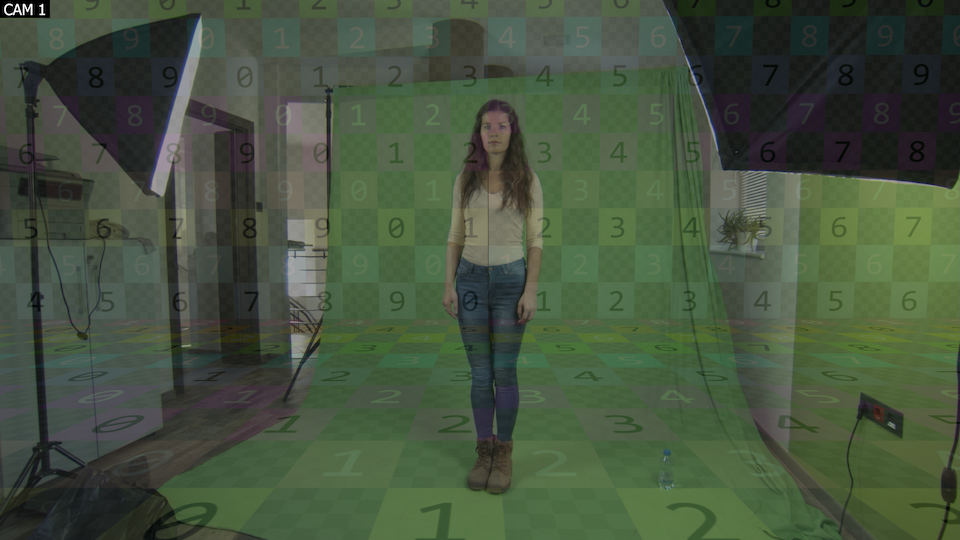 - グリーングリッド(壁グリッド): 現実のスタジオのグリーンスクリーンとアライメントし、動画入力の不要な部分をクロップするためのグリッド。