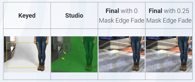 例えば、キーイング処理中に影を残す場合、マスクエッジフェードを使用すると、影がスタジオのクロップマスクを越えても、その境界がハッキリと切り取られることがなくなります。