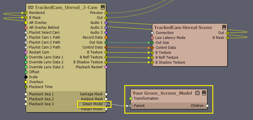 このモードを使用するには、グリーンスクリーンの3Dモデルを提供し、それをカメラコンパウンドのグリーンモデルピンに接続する必要があります:
