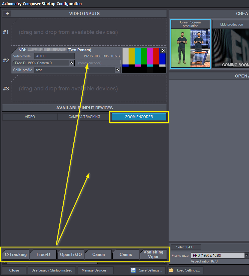 次に、該当するレンズエンコーダーを利用可能な入力デバイスフィールドにドラッグ&ドロップするか、ビデオ入力(マッピング済みデバイス)の下の空きスロットに配置します: