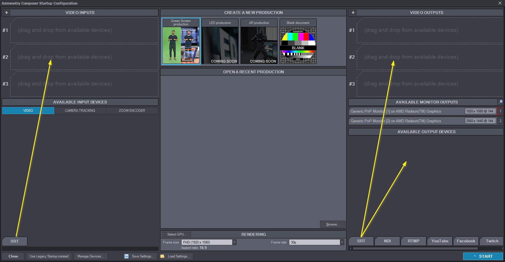 スタートアップ設定ウィンドウで、関連するSRTオプションをドラッグ&ドロップしてSRT入力または出力接続を設定できます: