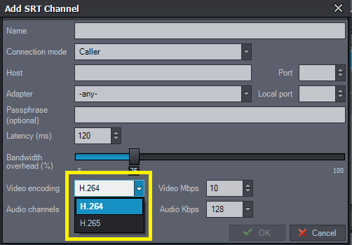 ビデオ入力にSRTを追加すると、SRTデバイス設定ウィンドウが表示されます: