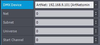DMXデバイス、ネット、サブネット、ユニバースのプロパティを、フィクスチャマトリクスデバイスの設定に従って指定します: