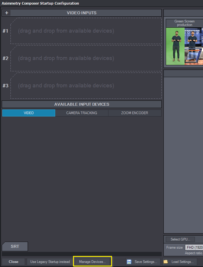Aximmetry Composerが既に実行されている場合、「デバイス管理...」オプションは編集メニューからもアクセス可能です。
