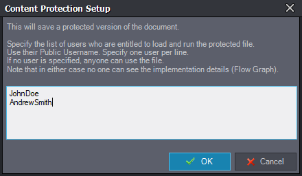 - 作成者がファイル / 保護付きで保存を選択すると、コンテンツ保護設定ウィンドウが表示され、許可するユーザーをリストアップできます。ユーザーは公開ユーザー名で指定する必要があります。リストを空のままにすると、ファイルは誰でも使用可能になります(もちろん、誰もその内容を見ることはできませんが)。