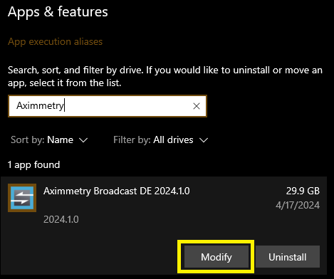 Aximmetry をインストール後、インストーラーを使用して以下の変更を行うことができます: