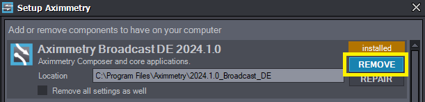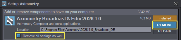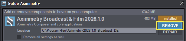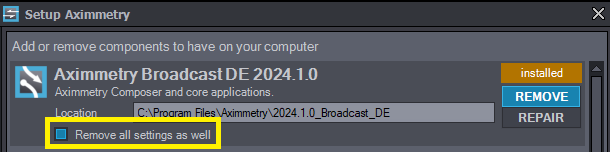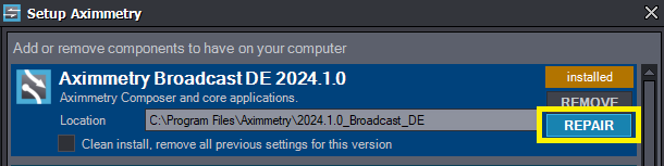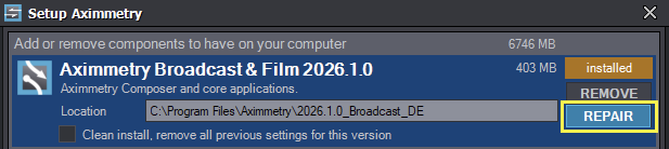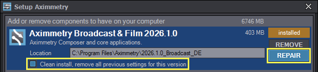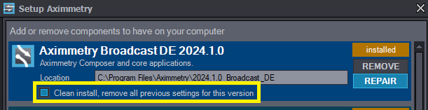 Aximmetryのクリーンインストールを実行するには、お使いのAximmetryエディションで「修復」を選択し、「クリーンインストール、このバージョンの以前の設定をすべて削除」ボタンを選択します: