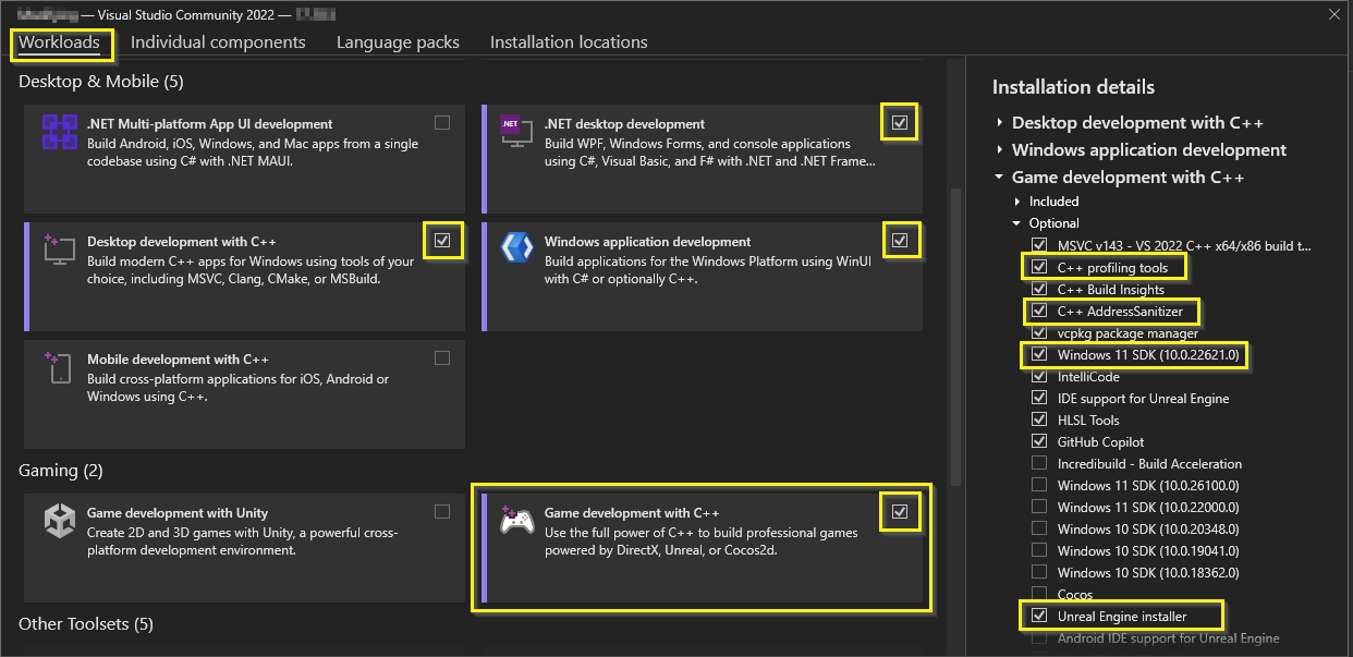 C++ を使用したゲーム開発を選択した場合、インストール詳細に以下を含めることを確認してください: