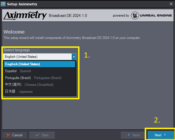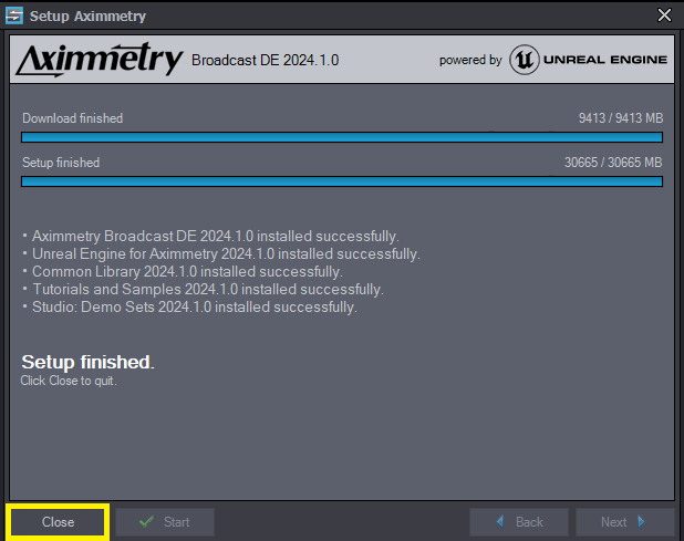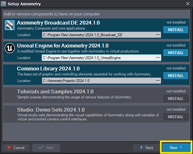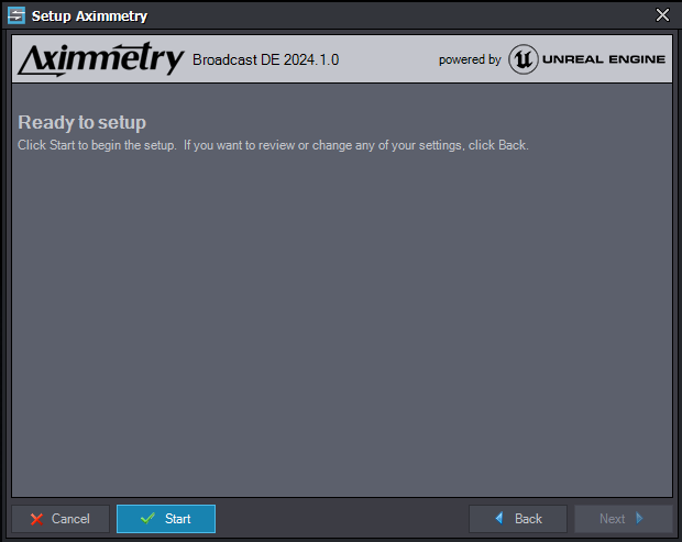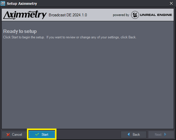 「開始」をクリックしてAximmetryおよびそのコンポーネントのインストールを開始します: