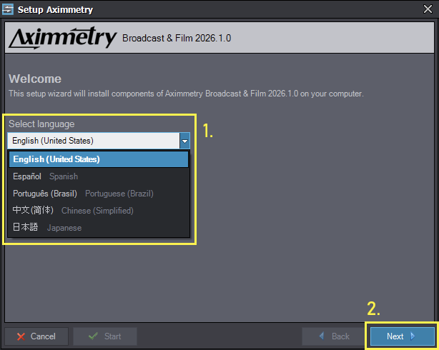 - Aximmetryインストーラーファイル(例:Aximmetry_Broadcast_&_Film_2026.1.0.exe)をダブルクリックして起動