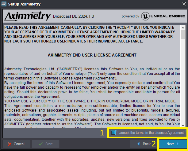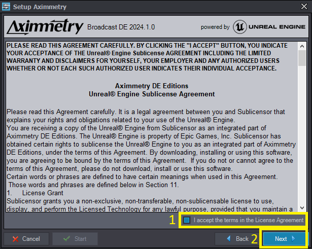Aximmetry DE版の場合、Unreal Engineサブライセンス契約にも同意が必要です: