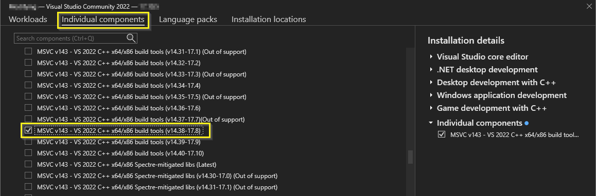 さらに、個別コンポーネントタブでMSVC v143 - VS 2022 C++ x64/x86 ビルド ツール (v14.38-17.8)を選択してください: