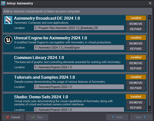 この文書では、Aximmetry およびそのすべてのコンポーネント(例:Aximmetry 用 Unreal Engine、コンテンツパッケージ)のインストール、修復、および削除プロセスについて説明します。