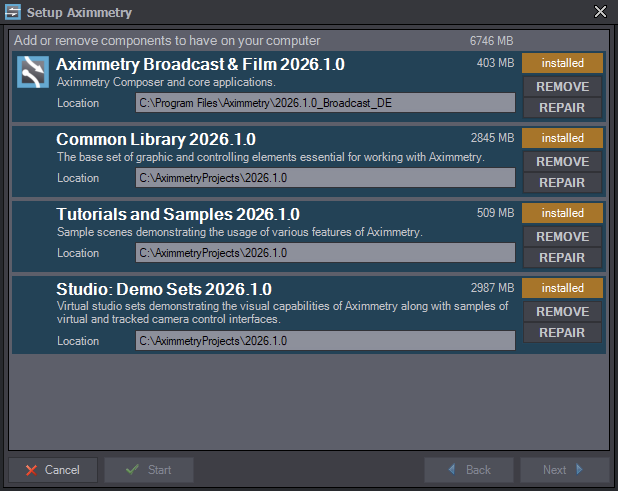 Aximmetry のインストール後、インストーラーを使用して以下の変更が可能です: