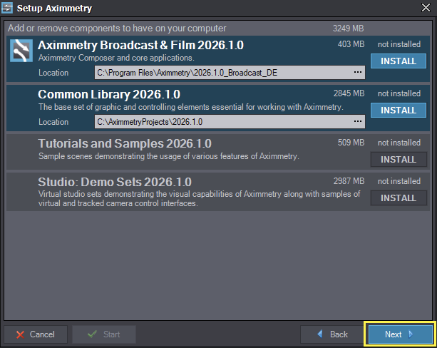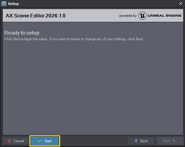 「開始」をクリックして、Aximmetry およびそのコンポーネントのインストールを開始します: