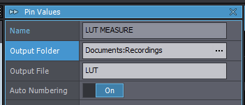 LUT MEASUREコントロールパネルを選択し、Pin Valuesパネルでターゲットのフォルダとファイル名パラメータを指定します:
