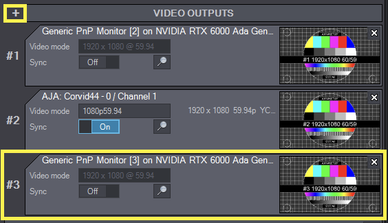 注記: 複数のLEDウォール出力を使用する場合、追加出力は順次インデックス番号(#4、#5、#6など)に設定する必要があります。これらのインデックス番号を作成するには、スクリーンショット左上隅で強調表示されている「+」ボタンをクリックしてください。