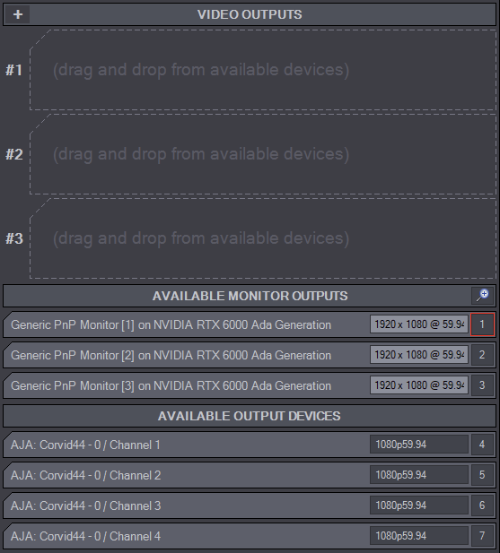 注記:最初の「利用可能なモニター出力」にはID番号が赤枠で強調表示されています。これはAximmetryのGUIが現在このビデオ出力デバイスに表示されていることを示しており、他の目的での使用は推奨されません。