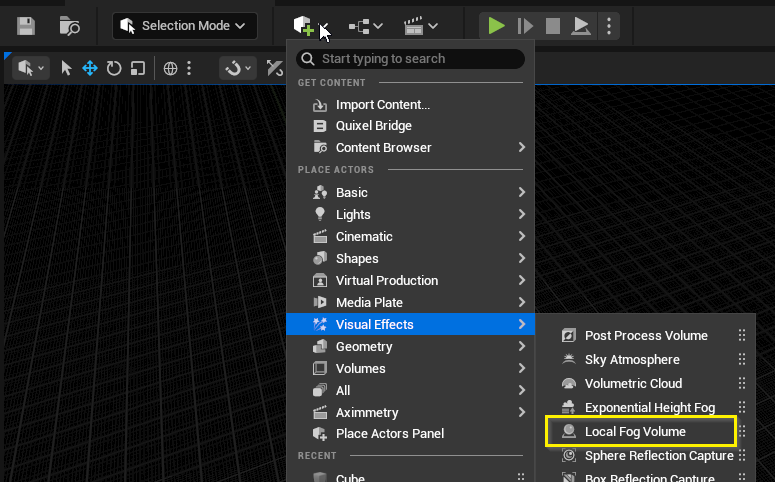 While Local Fog Volume can be used from the Place Actors menu to create fog effects:
