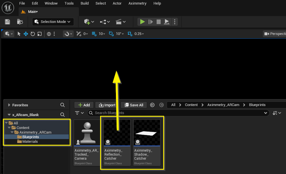 These solutions can be added by dragging and dropping them into your scene from the Content > Aximmetry_TrackedCam_AR > Blueprints folder in the Content Drawer panel: