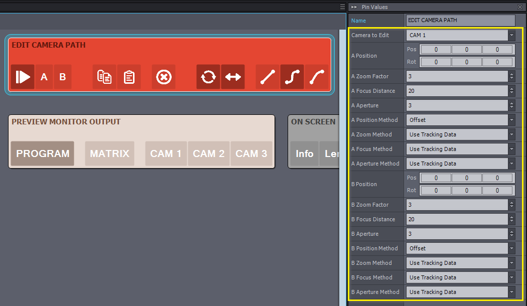 In Playlist Mode, you can program/externally control your cameras. In the Flow Editor, use the following pins on the TrackedCam compound to do this: