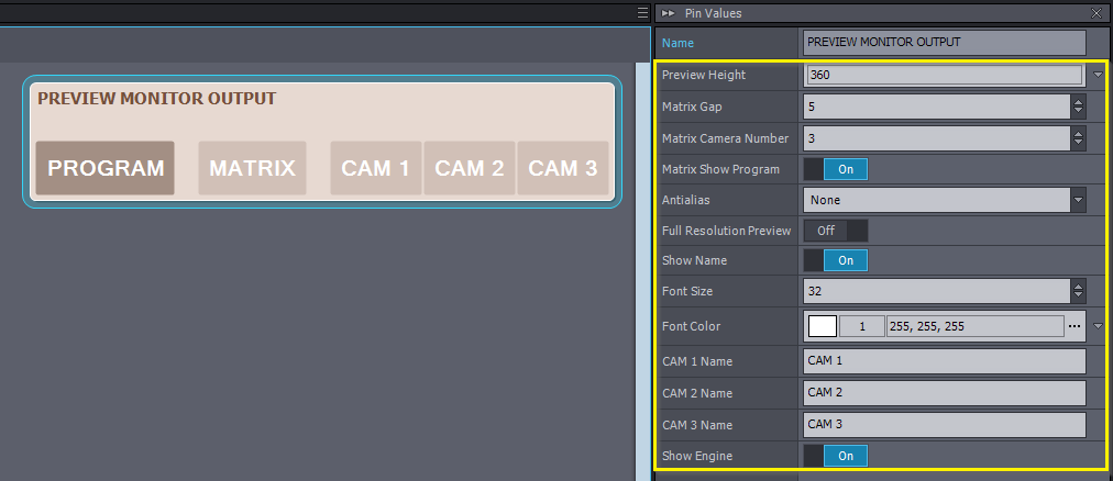 Whether to show the Cam 1,2,3... Name parameters in the top left text of the Preview Monitor Content and in the On Screen Info label.