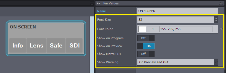 Displays various warnings or error messages on both the Preview and Out (final) outputs when set to On Preview and Out.