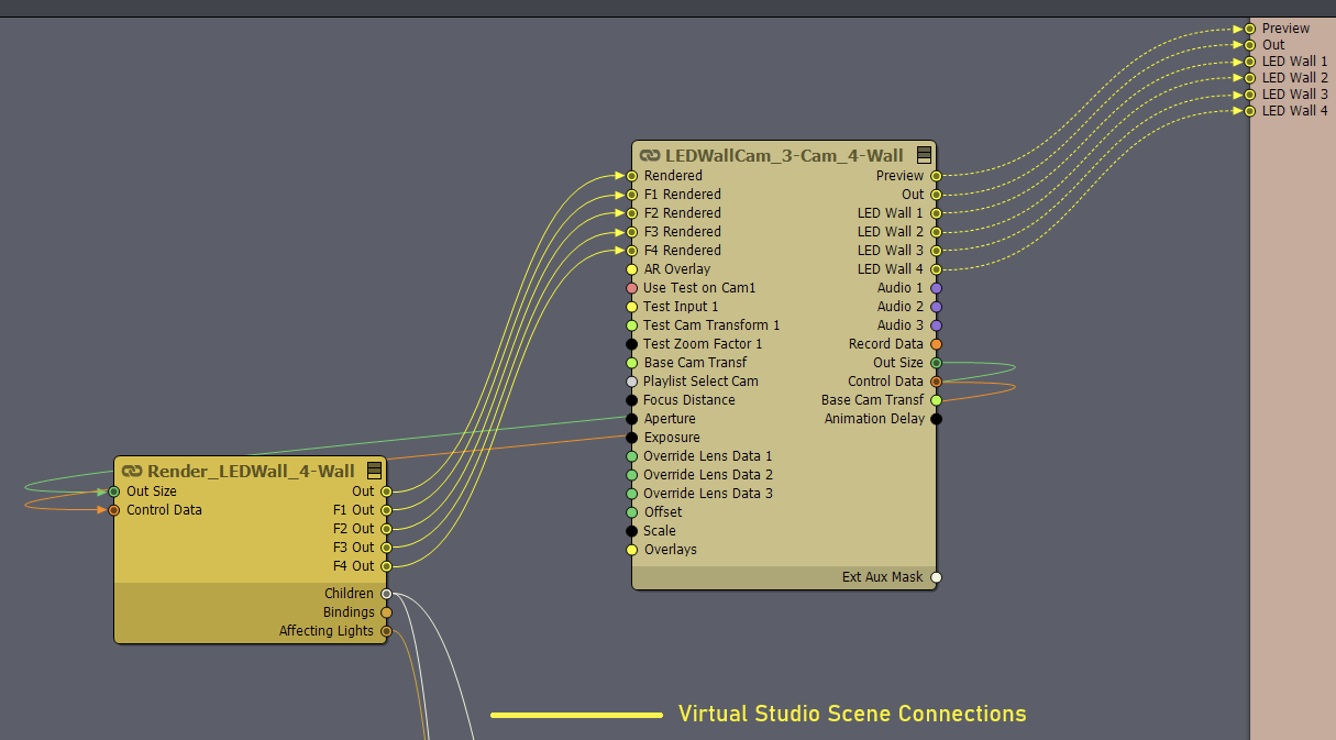 NOTE: Example of the required connections for 4 LED Wall outputs between the Render and an LEDWallCam compound.
