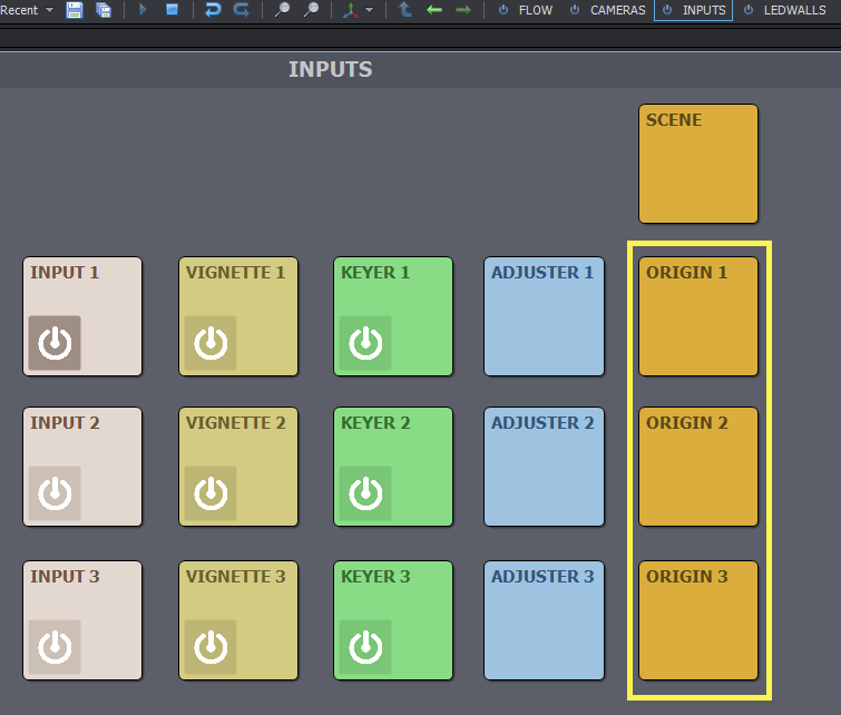 On the INPUTS control board, navigate to the ORIGIN X control panels.