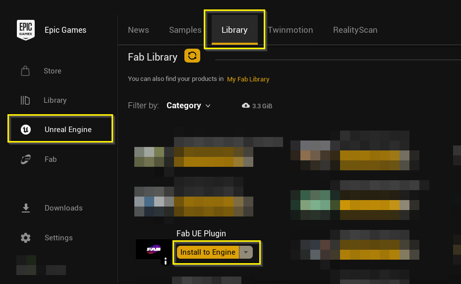 If the Fab Launcher Plugin was installed previously, but to a different version of Unreal Engine, go to the Unreal Engine tab in the Epic Games Launcher, then to Library.