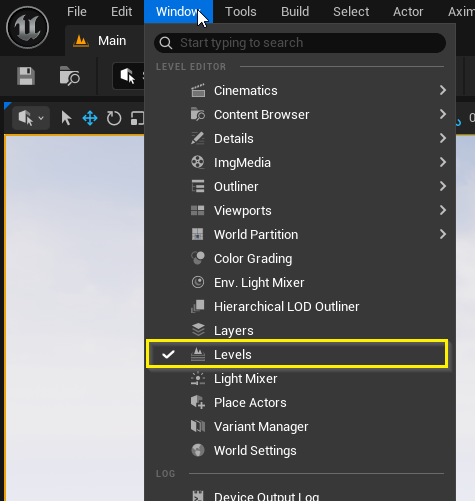 NOTE: This also applies to any similar action in Unreal Editor. The level highlighted by blue text in the Levels panel is the selected level, and level-specific actions of the Unreal Editor will target that. For example, when saving (CTRL + S), Unreal will only save the selected level.