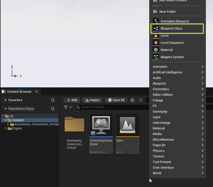 To create a Blueprint with an Open Level node, open Unreal's Content Browser, right-click, and select the Blueprint Class option: