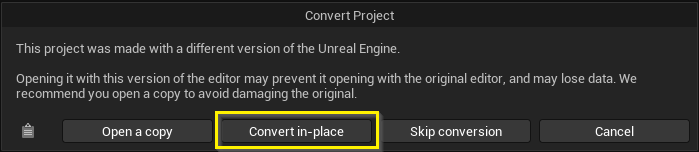 Once a project is converted, the process is irreversible — the project cannot be reverted to be compatible with previous versions of the Unreal Engine. Therefore, we strongly advise creating a complete copy of the original project before proceeding.