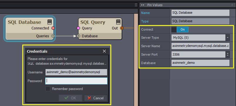 The SQL Database module connects to MySQL or Microsoft SQL server type. Once a Server Name URL and Schema are specified, the Connect pin is turned On, and the module is connected to an SQL Query module, the Credentials window will pop up to access the SQL database: