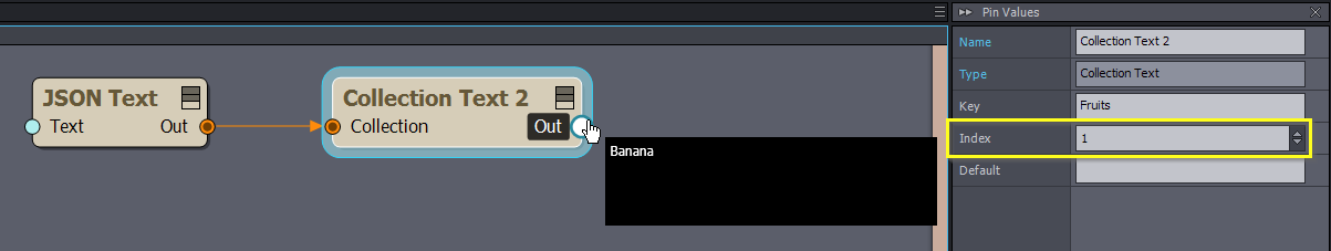 For example, in the following JSON, we retrieve the Banana fruit name by setting the Index to 1 for the Key Fruits: